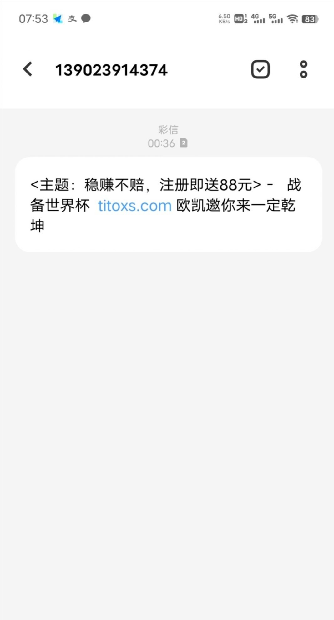 注册送88 注册找客服说领取特邀彩金,88只能打熊猫体育15倍流水,,开始还以为是黑台,结果提现秒到,应该不需要特邀,我朋友没收到短信注册也送了,必须走短信里面的链接注册才送 http://titoxs.com